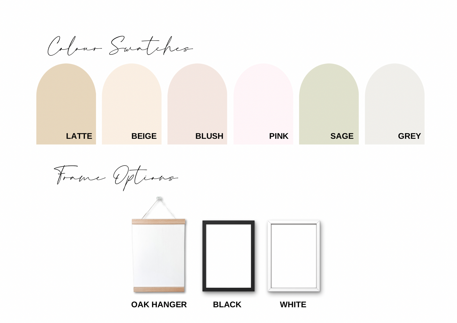 Prints are printed on 280gsm A4 linen cardstock. We have Black or White fibreboard frames or Oak Hanger Frames available for the prints.