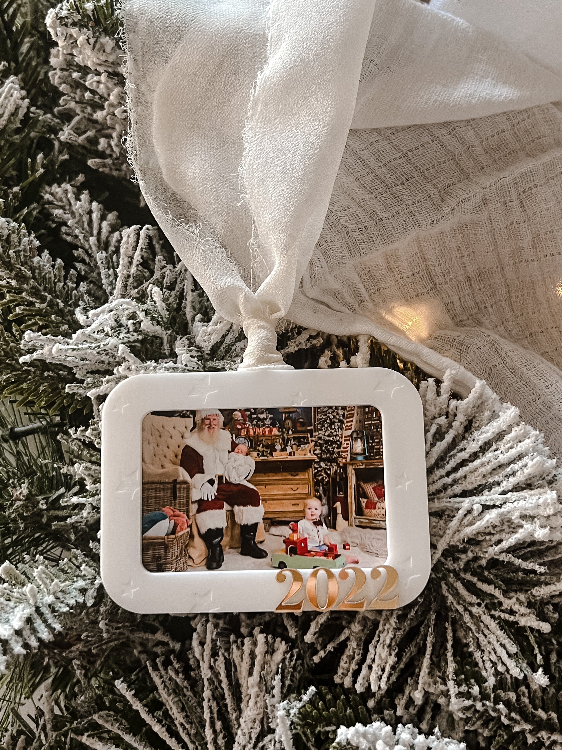 A beautiful frame ornament designed to display Santa photos from previous years, each frame is engraved with stars the year in mirror acrylic.